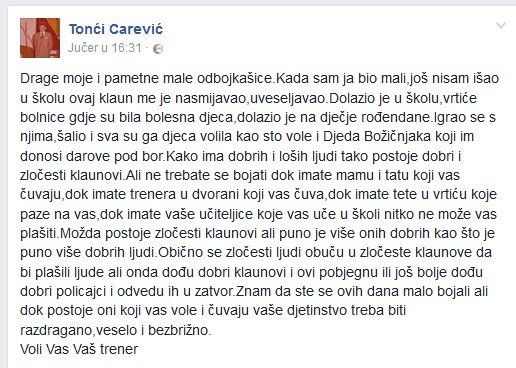 Drage moje i pametne male odbojkašice. Kada sam ja bio mali, još nisam išao u školu ovaj klaun me je nasmijavao, uveseljavao. Dolazio je u školu, vrtiće, bolnice gdje su bila bolesna djeca, dolazio je na dječje rođendane. Igrao se s njima, šalio i sva su ga djeca volila kao što vole i Djeda Božičnjaka koji im donosi darove pod bor. Kako ima dobrih i loših ljudi tako postoje dobri i zločesti klaunovi. Ali ne trebate se bojati dok imate mamu i tatu koji vas čuvaju, dok imate trenera u dvorani koji vas čuva, dok imate tete u vrtiću koje paze na vas, dok imate vaše učiteljice koje vas uče u školi, nitko ne može vas plašiti. Možda postoje zločesti klaunovi, ali puno je više onih dobrih kao što je puno više dobrih ljudi. Obično se zločesti ljudi obuku u zločeste klaunove da bi plašili ljude ali onda dođu dobri klaunovi i ovi pobjegnu ili još bolje dođu dobri policajci i odvedu ih u zatvor. Znam da ste se ovih dana malo bojali, ali dok postoje oni koji vas vole i čuvaju vaše djetinstvo treba biti razdragano,veselo i bezbrižno,' objavio je trener.