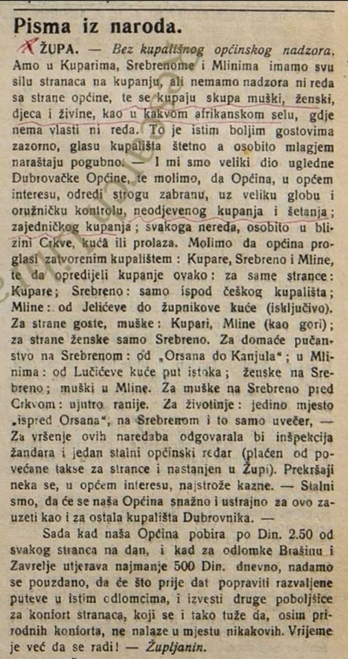 Facebook stranica 'Župa nekad' objavila je pismo iz 1923. godine koje je objavljeno u dubrovačkom tjedniku 'Narodna svijest' gdje dio Župljana upozorava kako su ljudi na kupalištima neodjeveni, kako se muškarci i žene kupaju zajedno te kako dovode sa sobom i svoje ljubimce. U pismu je rečeno kako izgledaju kao 'kakvo afrkansko selo' pa predlažu termine i lokacije na kojima bi se kupale samo žene odnosno samo muškarci. Pismo prenosimo u cijelosti.