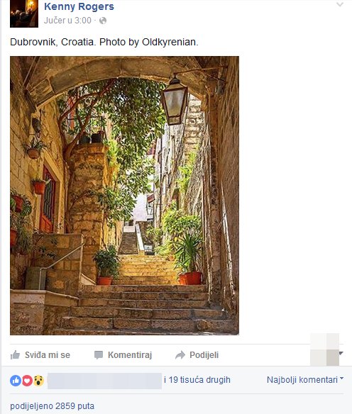 No, osim turista koji ga rado posjećuju i svjetskih medija, njegovoj ljepoti dive se i brojne poznate zvijezde. Tako je američka pjevačka zvijezda Kenny Rogers, koja je ujedno i član Kuće slavnih contry muzike, podijelila fotografiju Dubrovnika na svom Facebook profilu.