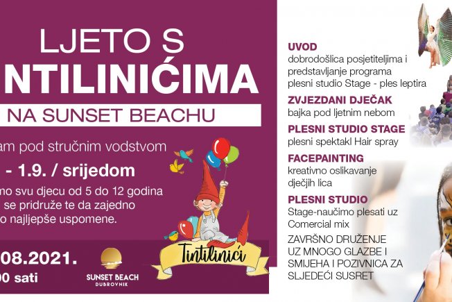 Sunset Beach Dubrovnik u suradnji s Tintilinićima sa zadovoljstvom poziva sve roditelje da pridruže svoje dijete kreativnim radionicama koje počinju već ove srijede u 18:00 sati, a trajat će cijeli osmi mjesec.