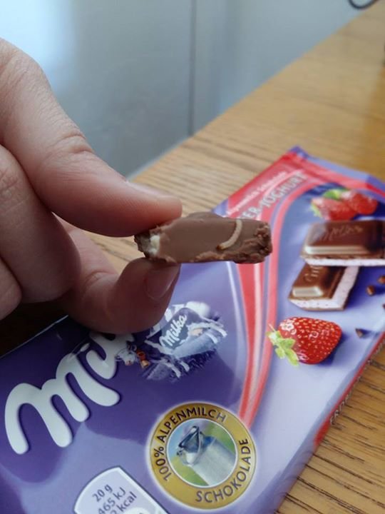 “Hvala Milki na proteinskom obroku koji sam pronašla jutros u ovom pakiranju”, napisala je na Facebooku obožavateljica Milke, koja je u svojoj čokoladi s jagodama naišla na gadljiv dodatak.