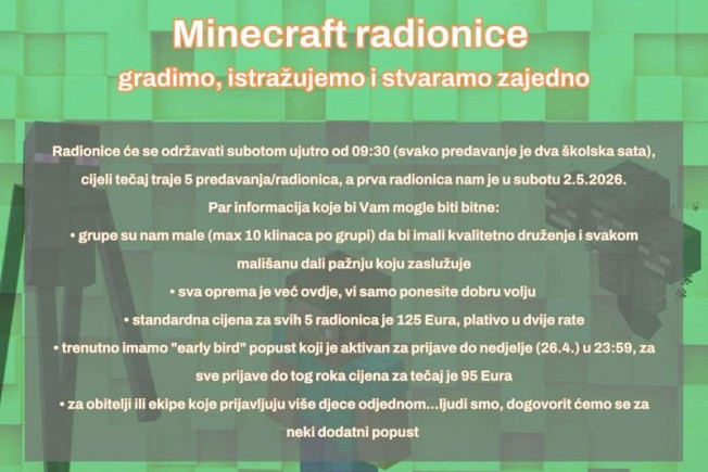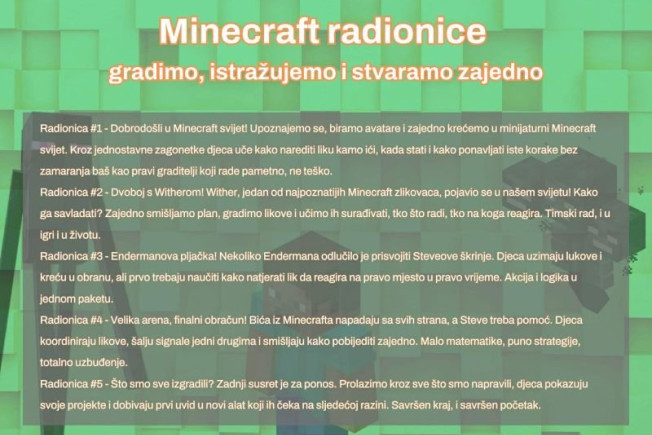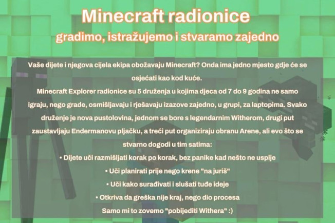Minecraft Explorer radionice su 5 druženja u kojima djeca od 7 do 9 godina ne samo igraju, nego grade, osmišljavaju i rješavaju izazove zajedno, u grupi, za laptopima. Svako druženje je nova pustolovina, jednom se bore s legendarnim Witherom, drugi put zaustavljaju Endermanovu pljačku, a treći put organiziraju obranu Arene, ali evo što se stvarno dogodi u tim satima: