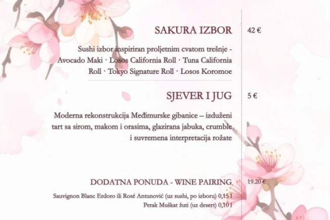 Uključuje Sauvignon Blanc Erdoro ili Rose Antunović uz sushi, Perak Muškat žuti uz desert te čašu Chandon Garden Spritza kao piće dobrodošlice.