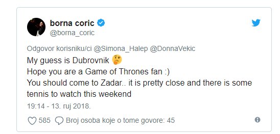 "Nagađam da si u Dubrovniku. Nadam se da si obožavateljica ‘Igre prijestolja’. Trebala bi doći u Zadar. Blizu je, a i mogla bi gledati malo tenisa ovog vikenda", odgovorio joj je Borna, koji je slavio u prvom meču Davis Cupa.