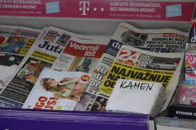 Tako je jedna prodavačica na dubrovačkom kiosku odlučila staviti kamen na novine kako ne bi odletjele. Ništa tu ne bi bilo čudno da isti nije umotala u papir i napisala 'kamen' vjerojatno kako se znatiželjni kupci ne bi pitali što je unutra umotano i eventualno to 'nešto' pokušali kupiti. Kako to izgleda, pogledajte na fotografijama.