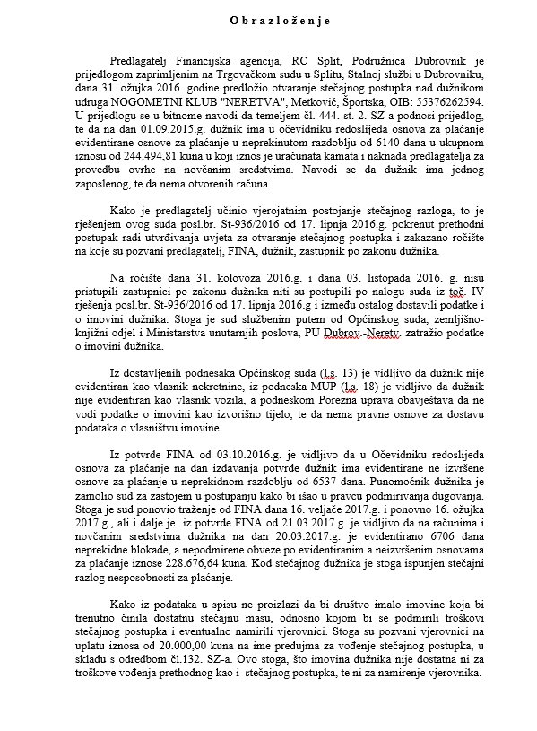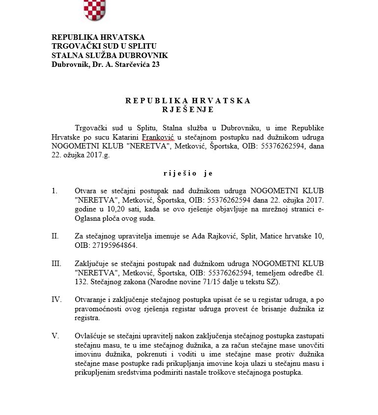 Konačno, prije nešto malo više od mjesec dana dubrovačka ispostava Trgovačkog suda otvara i zatvara stečajni postupak nad Nogometnim klubom Neretva iz Metkovića te ga gasi iz sudskog registra, iako su molili za zastoj s procesom stečajnog postupka, ne učinivši ništa kako bi uvjerili FINA-u, niti Trgovački sud, podružnicu Dubrovnik da će srediti financijsko stanje kluba. Niti su to napravili u doglednom vremenu, pa je sud po skraćenom postupku okončao agoniju.