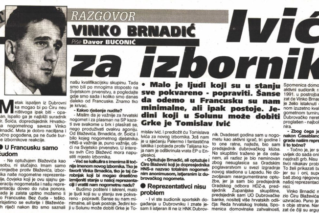 U razgovoru tadašnji dopredsjednik Hrvatskog nogometnog saveza Vinko Brnadić javno je dovodio u pitanje izbornika hrvatske reprezentacije Ćiro Blažević te predlagao da ga zamijeni trener Tomislav Ivić.