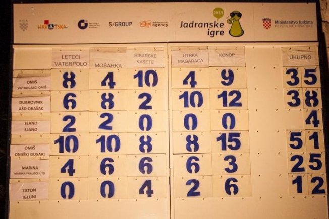 Pirati iz Omiša i ovog su puta uzeli ništa drugo nego zlato. Sa ukupno osvojenim 51 bodom Omiški gusari potvrdili su status favorita Jadranskih igara te izborili svoju kartu za dalje. Na drugom je mjestu sa ukupno 38 bodova bila mlada i perspektivna ekipa AŠD Orašac, koji su tri dana ranije slavili u Slanome. Treće je pak mjesto pripalo herojima jučerašnjeg dana, Vatrogascima iz Omiša. Noć prije ovi su hrabri momci proveli na požarištu spašavajući kuće u mjestu kraj Omiša. Kada su vatrenu stihiju priveli kraju, sjeli su u autobus te sa svojim vjernim navijačima i Gusarima krenuli put Zatona na igre. Što reći? Hrabrost i borba odlika je ove ekipe u svim pogledima, što je na kraju krajeva i nagrađeno prolaskom dalje na prvu četvrtinu ovogodišnjih Jadranskih igara.