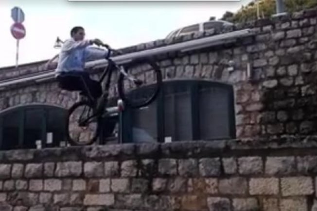 KAKAV 'LUĐAK' Vozi biciklu na 'zadnjoj' na zidiću na Buži, a ispod njega provalija (VIDEO)