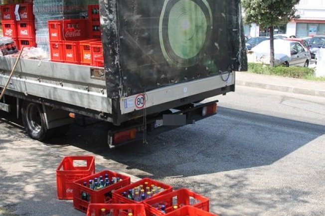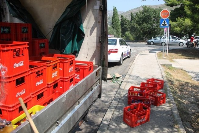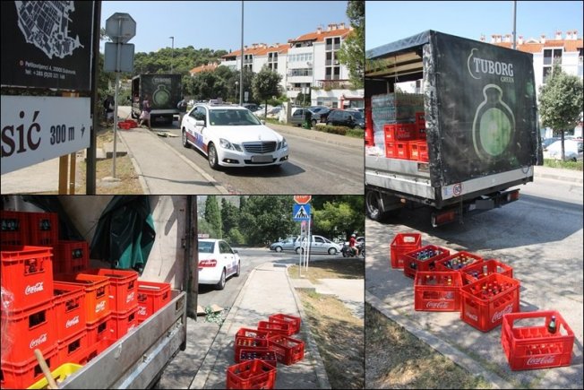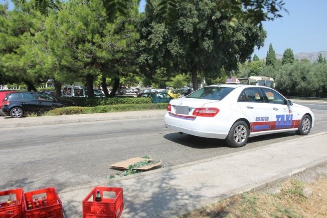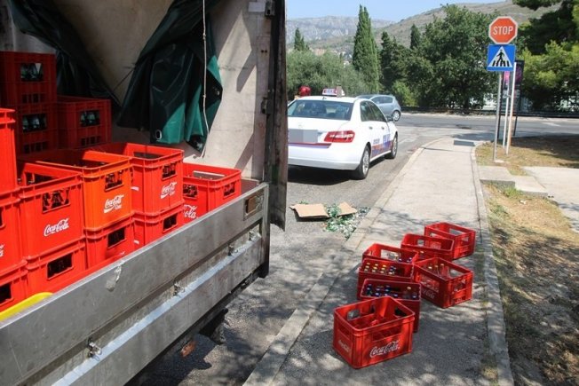 Naime, vozač je u kamionu prevozio gajbe u kojima su se nalazile boce piva i Coca-Cole. U jednom trenutku su gajbe počele ispadati po putu te je jedna pogodila i taksi vozilo.