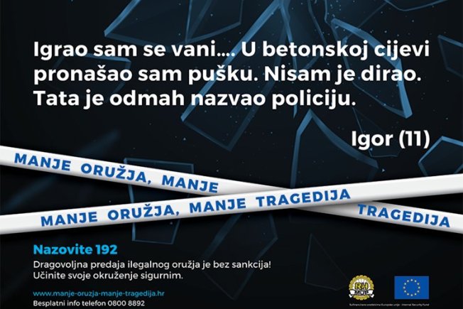 Također je važno naglasiti da građani ne donose oružje ili eksplozivne tvari osobno u policijsku postaju ili upravu, kako ne bi došlo do njihovog aktiviranja i neželjenog ozljeđivanja, već da o tome obavijeste policiju na broj 192 nakon čega će stručni i osposobljeni policijski službenici doći na njihovu kućnu adresu prikupiti oružje, stoji u priopćenju policije.