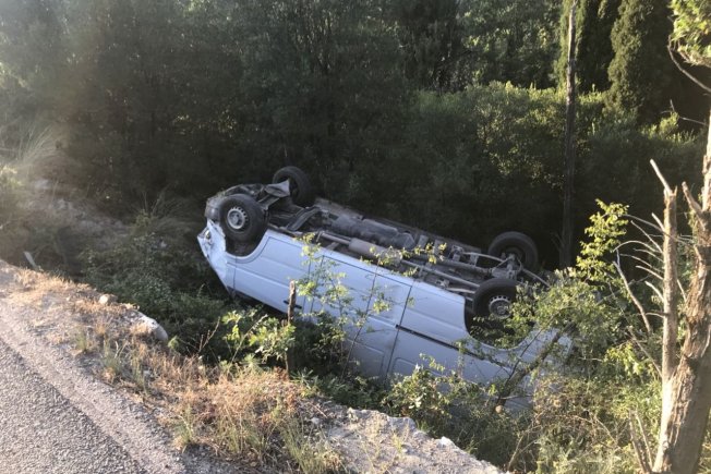 Automobil dubrovačkih registracijskih oznaka sletio je s ceste i prevrnuo se na krov. Na teren je izašla i hitna pomoć, no vozač je kazao kako mu nije potrebna. Inače, policija je vozača našla na benzinskoj crpki u Komolcu gdje se udaljio nakon nezgode.