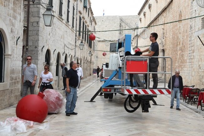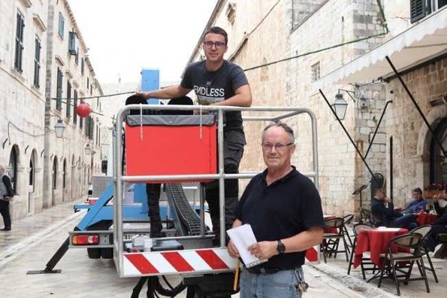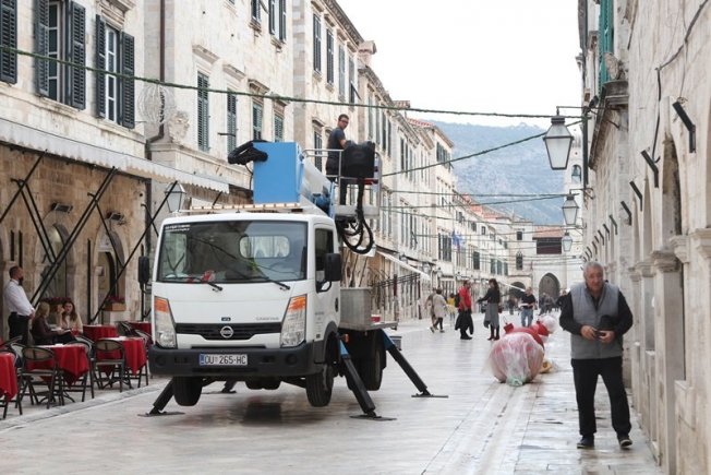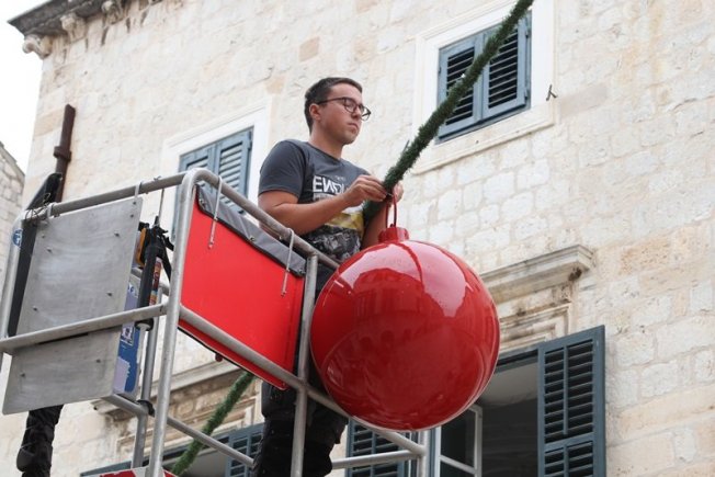 Lukša Malohodžić, dubrovački meštar od struje, sa svojom ekipom postavlja na Stradunu blagdanske ukrase.