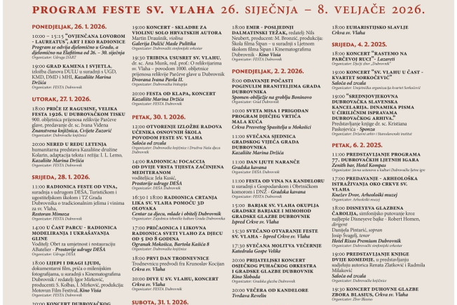 Detaljan program Feste svetoga Vlaha i Dana Grada Dubrovnika 2026. godine možete vidjeti na fotografiji.