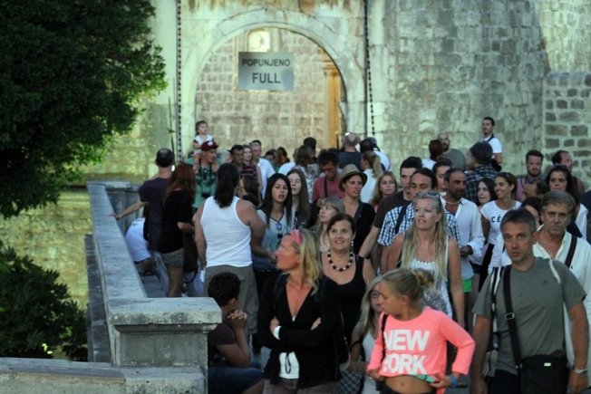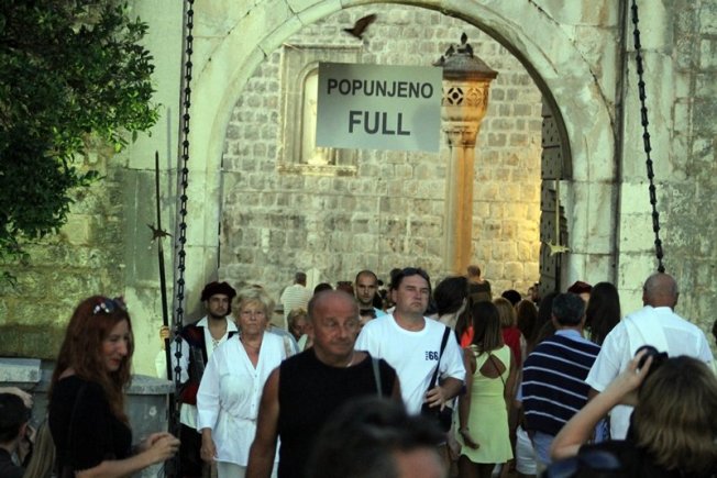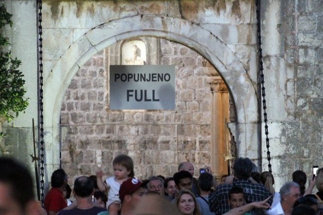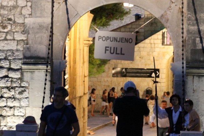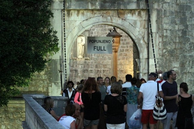 Turisti su s nevjericom gledali i fotografirali natpise koji su u ponedjeljak navečer postavljeni na ulazu u Grad s Pila i Ploča. Na natpisima, kao da je riječ o parkingu, stoji - Popunjeno! Full! Zanimljivo je da su natpisi postavljeni u tjednu kada Dubrovnik slavi dvomilijuntno noćenje, ove godine osam dana ranije nego prošle.