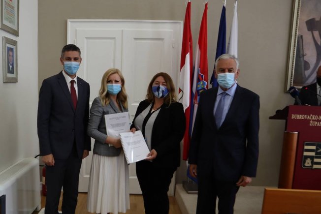 Župan Nikola Dobroslavić sa zamjenicom Žaklinom Marević te pročelnicom UO za društvene djelatnosti Jelenom Dadić nazočio je danas u Velikoj vijećnici svečanosti u kojoj je državna tajnica Ministarstva rada, mirovinskog sustava, obitelji i socijalne politike Margareta Mađerić uručila ugovor za projekt “Ruka Dobrote”, vrijednosti 843.770,14 kuna, ravnateljici Caritasa Dubrovačke biskupije Sanji Šanje. Svečanosti uručenja također je nazočio i gradonačelnik Mato Franković sa zamjenicom Jelkom Tepšić.