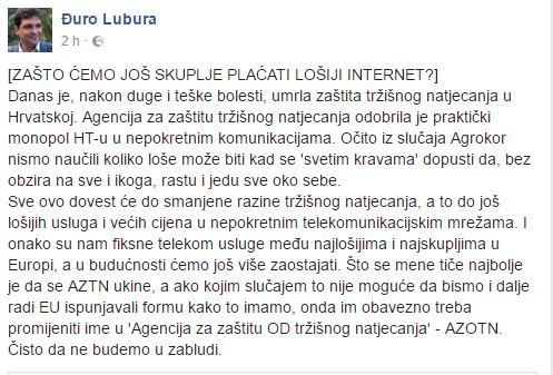 'Danas je, nakon duge i teške bolesti, umrla zaštita tržišnog natjecanja u Hrvatskoj. Agencija za zaštitu tržišnog natjecanja odobrila je praktički monopol HT-u u nepokretnim komunikacijama. Očito iz slučaja Agrokor nismo naučili koliko loše može biti kad se 'svetim kravama' dopusti da, bez obzira na sve i ikoga, rastu i jedu sve oko sebe.
