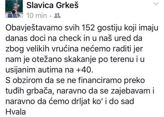 'Obavještavamo svih 152 gostiju koji imaju danas doći na check in u naš ured da zbog velikih vrućina nećemo raditi jer nam je otežano skakanje po terenu i u usijanim autima na +40. S obzirom da se ne financiramo preko tuđih grbača, naravno da se zajebavam i naravno da ćemo drljati k'o i dosad. Hvala!," objavila je.