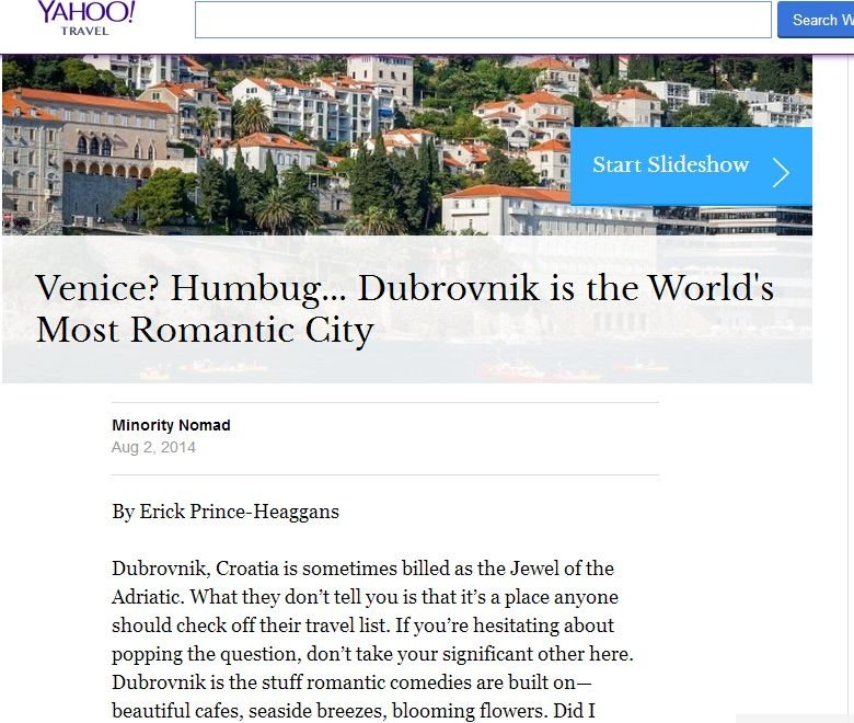 To je naslov teksta koji je objavio portal Yahoo Travel. Autor Erick Prince-Heaggans tvrdi da je Dubrovnik romantičniji od Venecije, odnosno da pretendira Parizu oduzeti titulu grada ljubavi. -'Ako oklijevate oko prosidbe, onda ne vodite svoju bolju polovicu u Dubrovnik.'