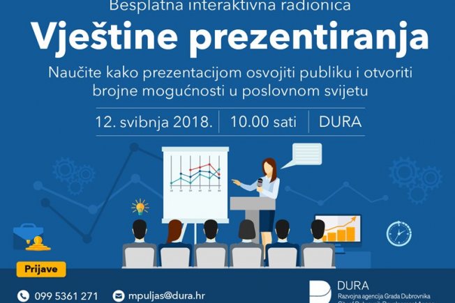 Kako bi naučili kako uspješno prezentirati za Vas smo organizirali radionicu „Vještine prezentiranja“ koja će se održati 12. svibnja 2018. godine u prostorijama DURA-e (Branitelja Dubrovnika 15) s početkom u 10:00 sati. Trajanje radionice je 8 sati.