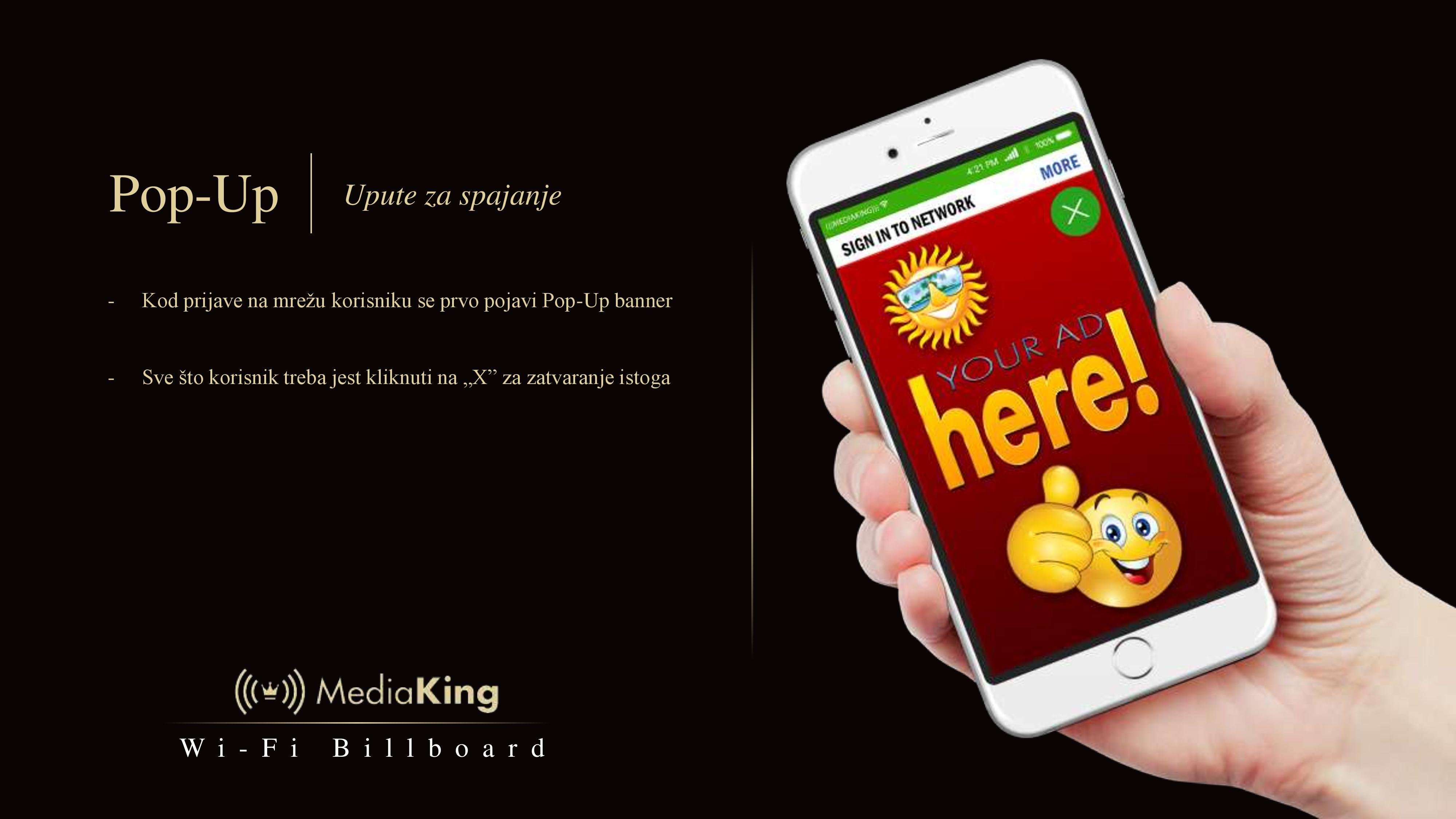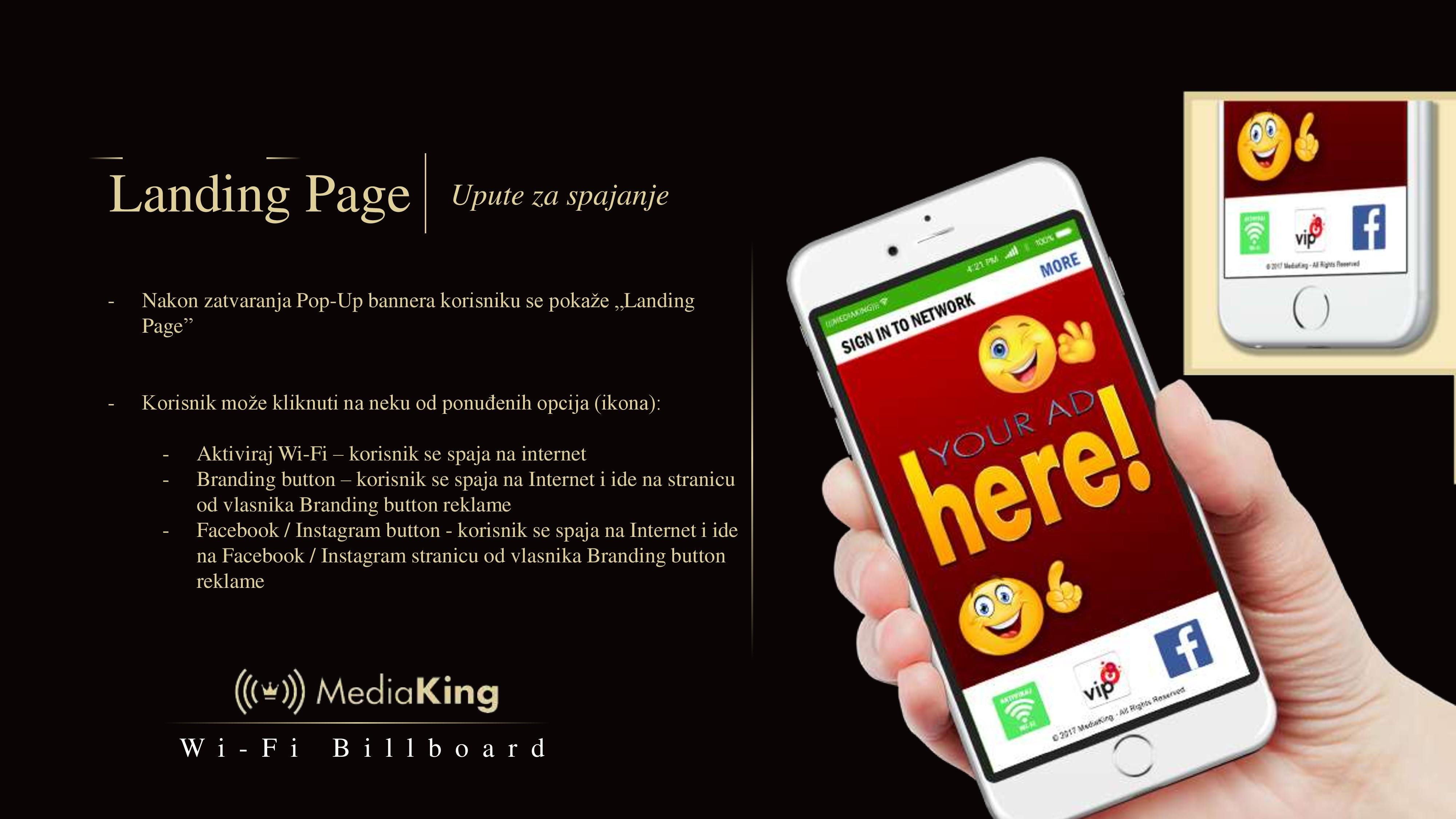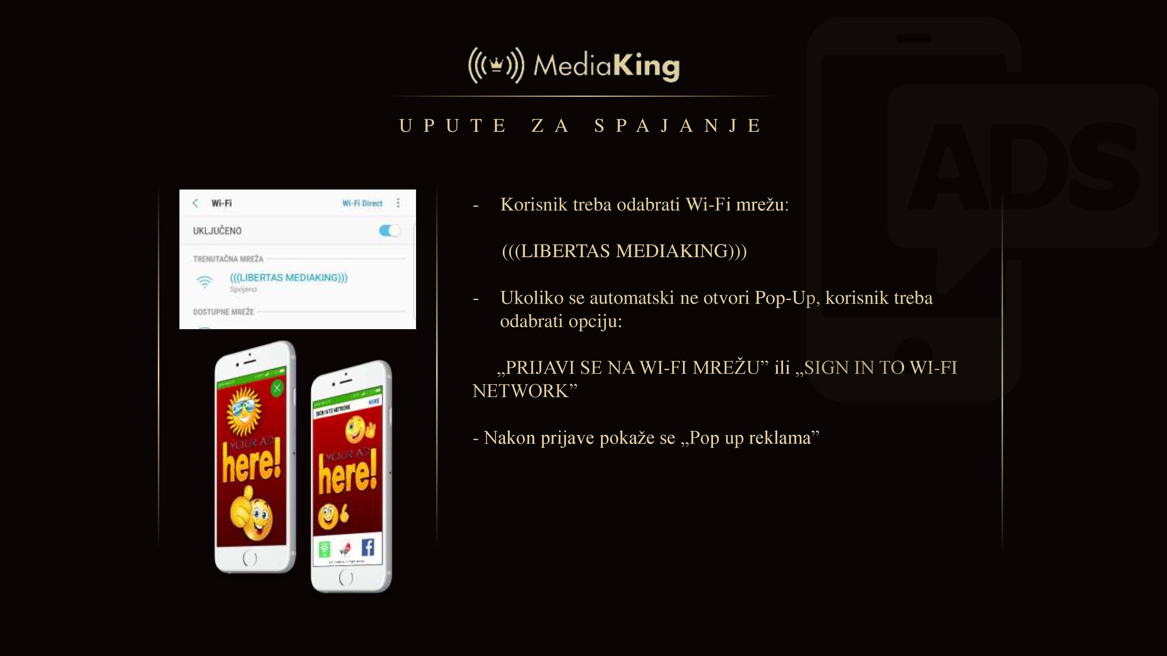 Sve što korisnici trebaju napraviti da bi koristili uslugu jest odabrati Wi-Fi mrežu „LIBERTAS MEDIAKING“ te pratiti jednostavne upute koje možete vidjeti u nastavku.