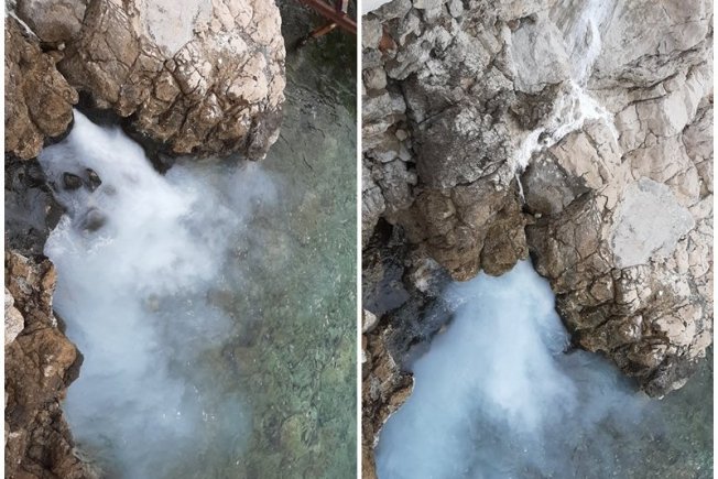 "Radi se o bijeloj pituri. Očito je netko tu pituravao pa pere kante i pribor. Jučer je bilo more kafenkasto. Danas se vidi ispod puta kako se slijeva niz stijene". - piše čitatelj