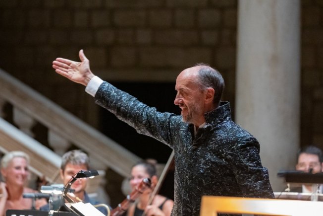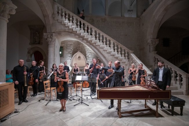 Hrvatski barokni ansambl nastupio je pod ravnanjem dirigenta Hervéa Niqueta u atriju Kneževa dvora sinoć, 14. kolovoza izvodeći skladbe Georga Friedricha Händela i Georga Philippa Telemanna. Solisti na koncertu bili su orguljaš i čembalist Pavao Mašić, violinistica Laura Vadjon, ujedno i ravnateljica ansambla, te trubač Krešimir Fabijanić.
