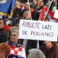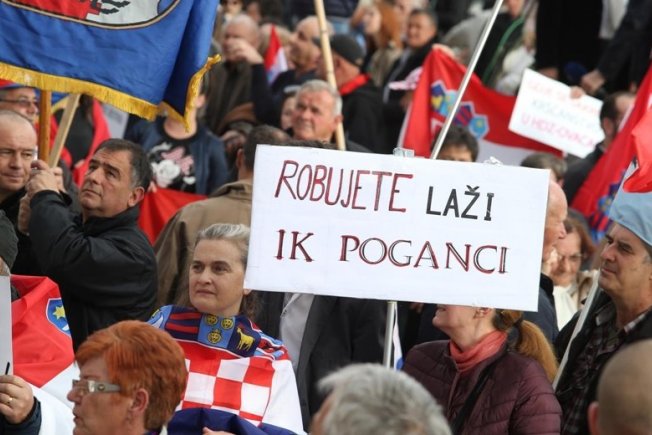 Transparenti na prosvjedu na Rivi: "Božinoviću nismo došli na Rivu pit kavu","HDZ = SDP = mafija", "Andrej Plenković za Pupovca suho zlato... za državu i narod živo blato.