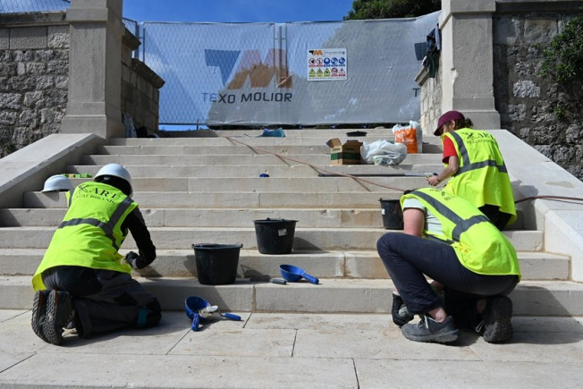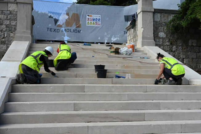 Upravo smo ih zatekli na obnovi stubišta gdje je provedeno temeljito čišćenje kako bi se uklonili slojevi biološkog obrasta, a potom fugiralo i rekonstruiralo ulazne skaline na kojima se nalaze brojna oštećenja. Otkrivaju kako u tom zahvatu koriste kvalitetne materijale kakvi su korišteni i pri obnovi Katedrale u Šibeniku.