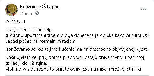 Iz OŠ Lapad su odgovorili kako je nova odluka donesena sukladno uputama epidemiologa te se ispričali roditeljima na prethodnoj obavijesti koju su uskoro uklonili sa stranice.