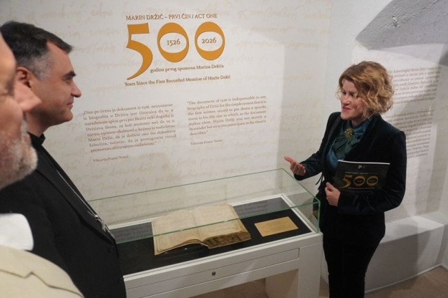 - Svjedočimo otvorenju iznimne izložbe kojoj je temelj isprava “Diversa Cancellariae“ koja se čuva u Državnom arhivu u Sponzi kojom se Marin Držić potvrđuje rektorom crkve Svih svetih, odnosno Od Domina. Temeljem ove isprave on prvi put stupa na pozornicu pisane povijesti, a upravo iz ove isprave od 12. travnja 1526. godine zaključujemo da je njegova godina rođenja 1508. Naime, ugledni istraživači smatraju kako je upravo ovu svetu i časnu dužnost mogao zaprimiti s 18 godina, iako postoji teorija da ju je mogao zaprimiti i ranije, a možda i kasnije. No, zasigurno znamo i što je sačuvano da je umro 1567. godine, kad je pokopan u dominikanskoj bazilici sv.Ivana i Pavla u Veneciji, poznatijoj kao San Zanipolo. Za nas je značajno kako je temelj ove izložbe dobra suradnja s Državnim arhivom u Dubrovniku, a spomenutu ispravu posudio nam je naš Državni arhiv. Ona je temelj za buduća istraživanja, ali i temelj onoga što Dom Marina Držića želi i teži postati sukladno svojoj viziji i misiji: znanstveno-istraživački centar za proučavanje i pružanje svih informacija o Marinu Držiću“.