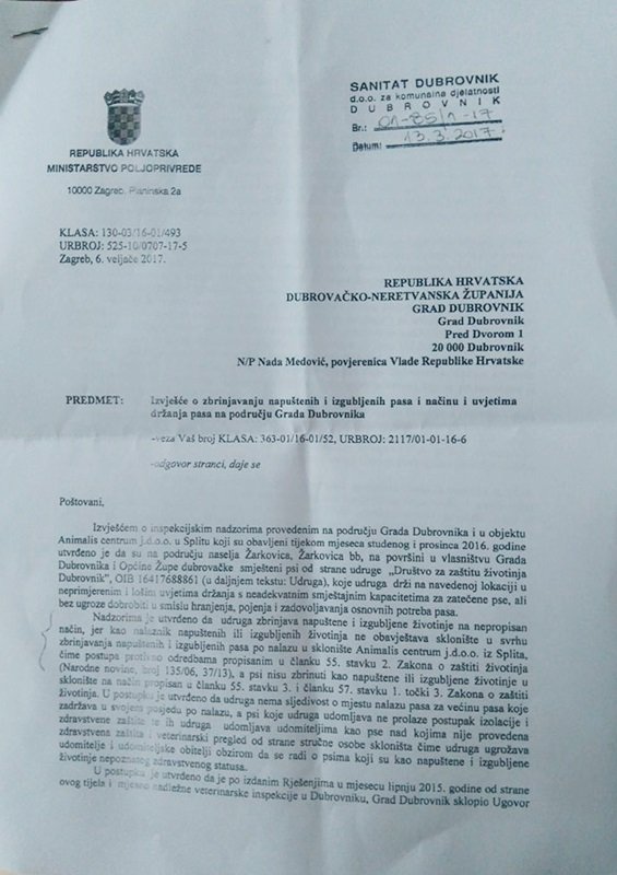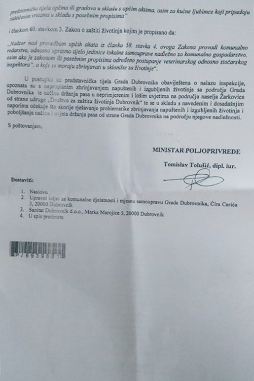 Samo izvješće dostavljeno je Upravnom odjelu za komunalne djelatnosti i mjesnu samoupravu Grada Dubrovnika te tvrtki Sanitat Dubrovnik, a potpisuje ga HDZ-ov ministar poljoprivrede Tomislav Tolušić.