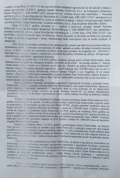 Također, u četvrtom odjeljku Izvješća stoji kako je tvrtka Sanitat Dubrovnik, kao naručitelj, sklopila ugovor o poslovnoj suradnji s Animalis centrumom iz Splita, kao izvršiteljem. Splitsko sklonište ovim ugovorom se obvezalo na mjesečno izmještanje 20 pasa iz azila na Žarkovici. Također, splitsko sklonište utvrđeno je kao 'NO KILL' sklonište.