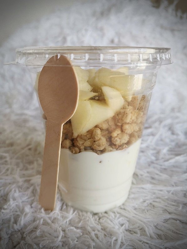 Za drugi obrok odabrali smo jogurt s granolom i voćem. Za početak trebala nam je jednokratna posuda. U specijaliziranom webshopu pronašli smo plastične čaše zapremnine 300 ml, za 2,50 eura u pakiranju od 50 komada. Za iste čaše 50 poklopaca košta 2,50 eura. Jednokratne žlice su 4,50 eura za 100 komada. Što se tiče cijene jedne ambalaže s poklopcem i žlicom to je 15 centi. Unutra smo stavili 150 g Lidl grčkog jogurta koji košta 2,99 po kilogramu, odnosno 0,45 eura po obroku. Na jogurt smo stavili 40 grama granole s lješnjakom i medom marke Familia što nas je koštalo 0,37 eura (4,64 na 500 grama pakiranje). Na kraju se na sve može dodati nešto sezonskog voća koje možemo pribrojiti u centima. Cijena obroka bi s voćem bila nešto preko 1 euro.