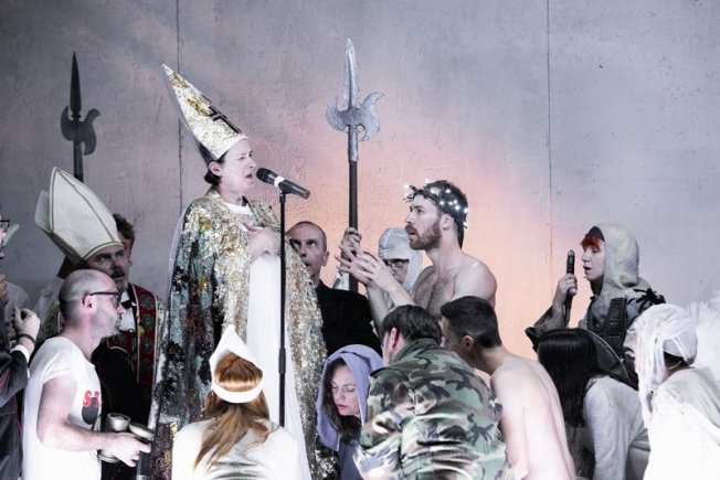Autorski tim uz Sebastijana Horvata i Milana Markovića Matthisa čine Igor Vasiljev koji potpisuje upečatljivu scenografiju i video, kostimografkinja Belinda Radulović, suradnica za pokret Ivana Kalc, oblikovatelj svjetla Aleksandar Čavlek i oblikovatelj tona Saša Predovan. Predstava je uvelike vođena glazbom, a potpisuje je Karmina Šilec. Jak ansambl riječke Hrvatske drame čine: Olivera Baljak, Jelena Lopatić, Tanja Smoje, Marija Tadić, Aleksandar Cvjetković, Edi Ćelić, Dean Krivačić, Jasmin Mekić, Nikola Nedić uz člana Talijanske drame Giuseppea Nicodema. Glavnu ulogu Michelangela u prvom činu sjajno je odigrao Rakan Rushaidat, a Redatelja u drugom činu Jerko Marčić. Za dojmljivost predstave uvelike su zaslužni dubrovački zboristi koji na lokrumskoj sceni čine Kor fanatika: Lovro Barišić, Magdalena Kačić Barišić, Jelena Beželj, Mario Bogdanović, Mislav Ćimić, Barbara Horvat, Antun Končić, Barbara Ogresta, Lukrecija Prcela, Dea Qivlaku, Ljubo Radić, Tanja Šimunović, Ivana Tasovac, Antonio Težak, Slobodan Varezić i Petar Vlašić s voditeljicom Majom Marušić.