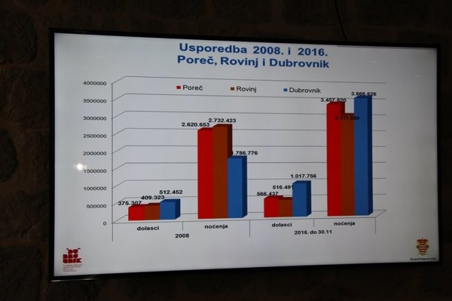 '2008. godine u Poreču je ostvareno preko 2 700 000 noćenja, a ove godine preko 3 100 000. Za osam godina su porasli za 400 tisuća. Dobili su autocestu, imaju sve moguće kapacitete. Rovinj je 2008. godine imao oko 2 600 000 noćenja, ove godine oko 3 400 000. Dakle, porasli su za 900 tisuća. Dubrovnik je 2008. godine imao preko 1 700 000 noćenja, a ove godine preko 3 700 000 noćenja. Kako je to jedan grad za osam godina skočio na toliku brojku, dakle za 2 milijuna? Infrastruktura nije važna, Dubrovnik je postao živi grad,' kazao je te dodao kako je Dubrovnik nekoć bio 'najdosadniji grad u regiji, a samo u prosincu je bilo 20-ak koncerata. 'Više je prošli mjesec bilo koncerata u Gradu nego od 2004. do 2008. godine zajedno, i to besplatnih, na otvorenom,' dodao je.