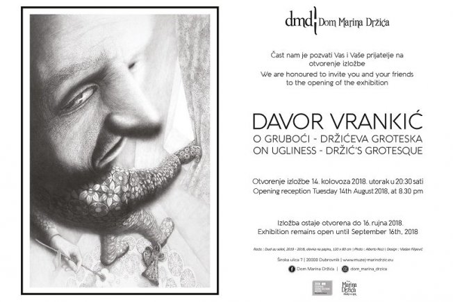 Nakon ovogodišnjih izložbi u Bruxellesu, Parizu i New Yorku, a prije velike izložbe u zagrebačkom MSU u 2019. godini, fascinantni umjetnik, pariški Osječanin Davor Vrankić dolazi u Dom Marina Držića gdje će 14. kolovoza biti otvorena njegova izložba „O gruboći – Držićeva groteska“.