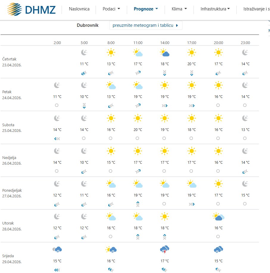 Prema vremenskoj prognozi DHMZ-a, danas se očekuje sunčano vrijeme i temperature zraka do 20 Celzijevih stupnjeva. I u narednim danima se očekuje sunačno vrijeme na dubrovačkom području, a sljedeće kišno razdoblje moglo bi se dogoditi tek u srijedu. Međutim, riječ je o dugoročnoj prognozi, a one su podložnije izmjenama.