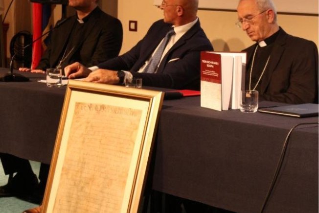-Uokvirena slika je replika dokumenta koju je Državni arhiv prije dvije godine 27.rujna 2022. uručio našoj Biskupiji o njezinoj 1000.obljetnici. Tom bulom papa Benedikta VIII dodjeljuje palij nadbiskupu dubrovačkom, utvrđujući njegovu jurisdikciju nad Zahumljem, Srbijom i Travunijom te gradovima Kotorom, Barom i Ulcinjem- čestitao je biskup dubrovački msg Glasnović i zahvalio svim organizatorima na silnom uloženom trudu.