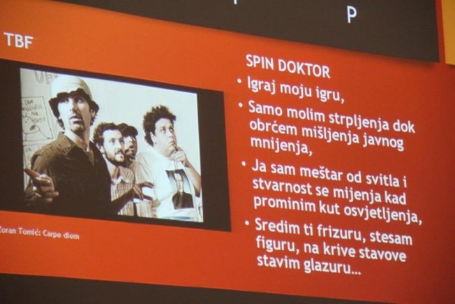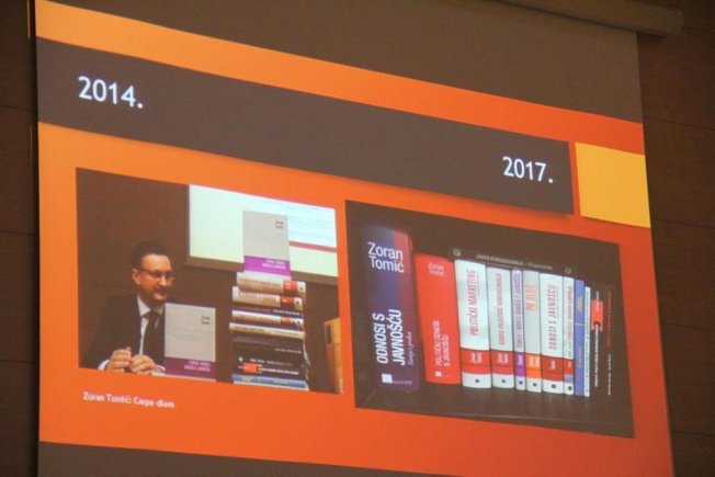 Obradović je na svoj prepoznatljiv način predstavio knjige uz audio-vizualne sadržaje te razne dosjetke poput onih kako je česta percepcija odnosa s javnošću u društvu manipulacija jer, kako je naveo, "danas djevojke obuku šorc i top i pođu izraditi vizt kartice na kojima piše menadžerica u odnosima s javnošću."