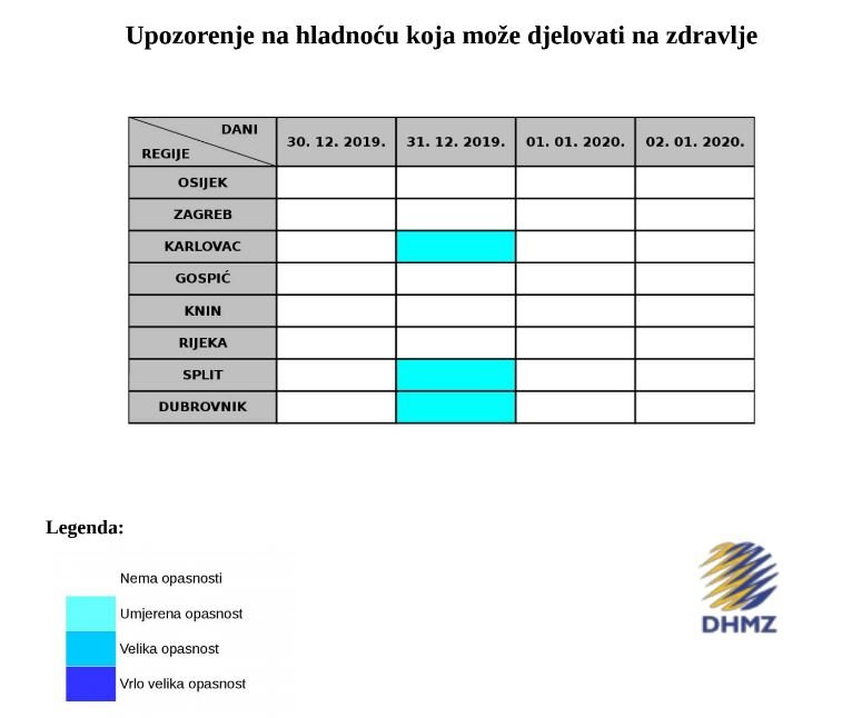 Prema državnom hidrometeorološkom zavodu za Dubrovačko-neretvansku županiju 31. prosinca prognozirana je umjerena opasnost od hladnog vala, dok za razdoblje 1.-2. siječnja 2020. godine nema opasnosti od hladnog vala.
