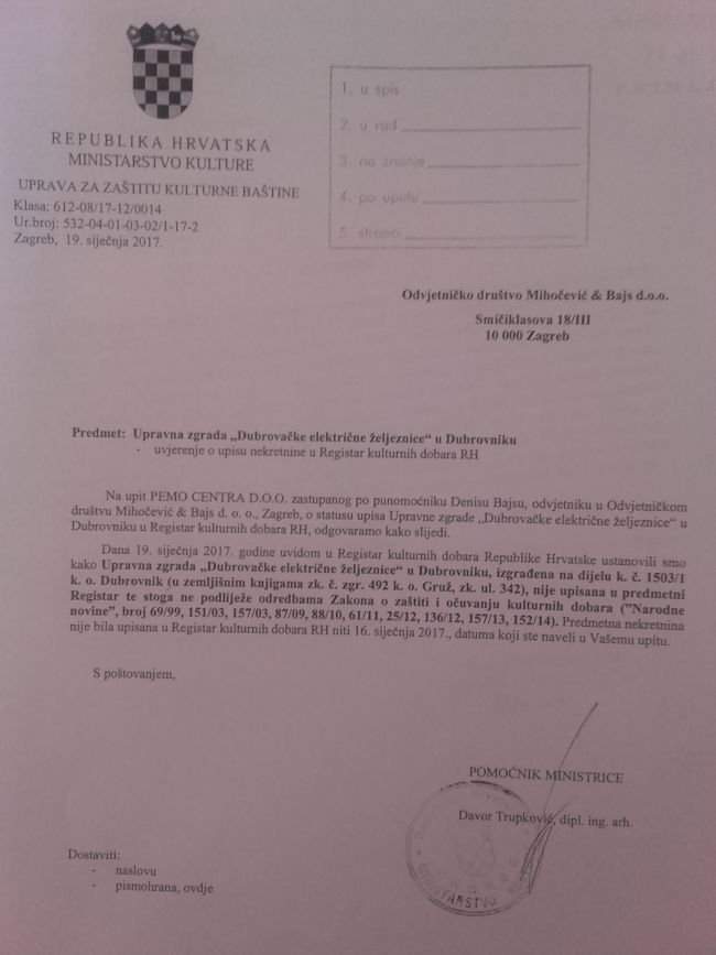 -Dana 19. siječnja uvidom u Registar kulturnih dobara RH ustanovili smo kako bivša upravna zgrada Dubrovačke električne željeznice nije upisana u predmetni registar, te stoga ne podliježe odredbama Zakona o zaštiti i očuvanju kulturnih dobara – među ostalim stoji u odgovoru Uprave za zaštitu kulturnih dobara Ministarstva kulture.