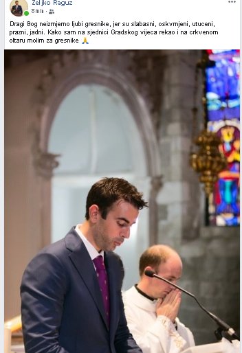 "Dragi Bog neizmjerno ljubi grešnike, jer su slabašni, oskvrnjeni, utučeni, prazni, jadni. Kako sam na sjednici Gradskog vijeća rekao, i na crkvenom oltaru molim za grešnike," objavio je uz fotografiju.