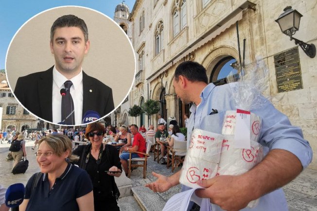 Dakle, "srđevci" su se uz današnji škerac naslonili na jučerašnji poziv na bojkot prozvoda Teta Violete od strane predsjednika gradskog vijeća Marka Potrebice. Oni su na toaletni papir napisali "Respect the city", te ga ustvari postavili ispred vrata gradske uprave.