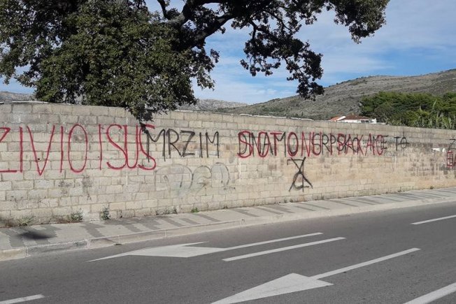 Nepoznati počinitelji na zidu su ispisali 'Živio Isus, sotoni pakao', a poviše toga 'Mrzim Dinamo, srpsko ime to'. Neprimjereni prizor kojim se vrijeđaju navijači Dinama te širi mržnja pogledajte na fotografijama.