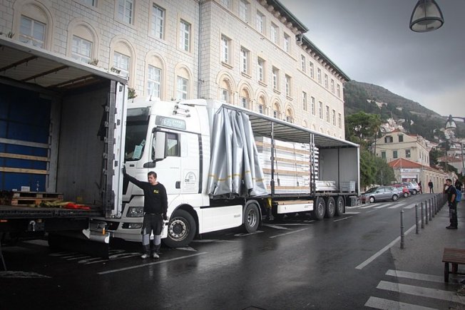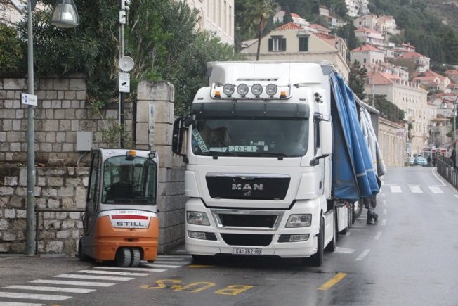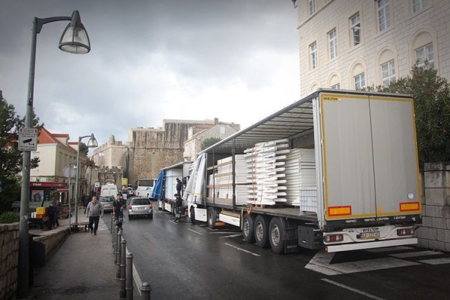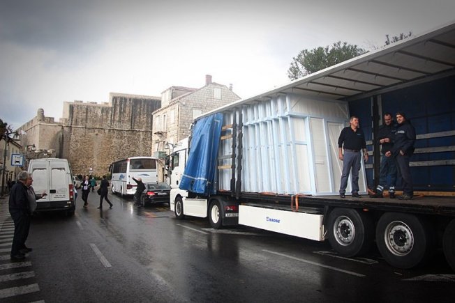 Prve adventske kućice jutros su stigle na Ploče odakle ih prebacuju na Stradun gdje će ih djelatnici Sanitata sklopiti.