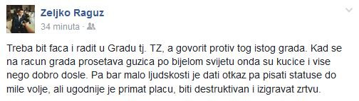 'Treba biti faca i raditi u Gradu tj. TZ, a govoriti protiv tog istog Grada. Kad se na račun Grada prošetava guzica po bijelom svijetu, onda su kućice i više nego dobro došle. Pa bar malo ljudskosti je dati otkaz pa pisati statuse do mile volje, ali ugodnije je primati plaću, biti destruktivan i izigravati žrtvu, stoji u njegovoj objavi.