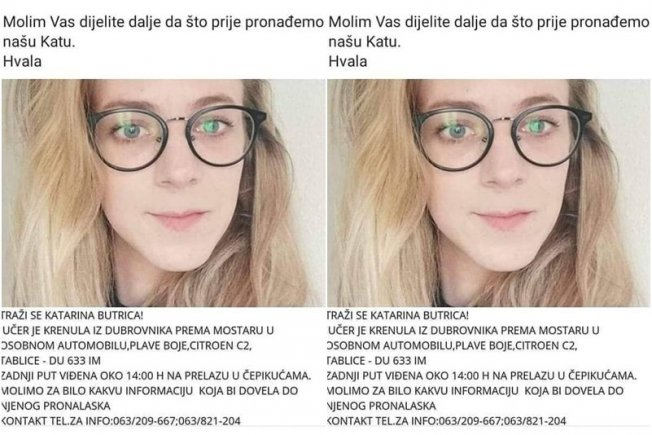 Društvenim mrežama dijeli se i fotografija, na kojoj piše kako je djevojka za Mostar krenula u osobnom automobilu Citroen C2, plave boje, registracije DU 633 IM. Zadnji put je viđena na graničnom prijelazu u Čepikićama. Kontakt telefon za one koji mogu javiti svoja saznanja o nestanku djevojke jest 00387 63 209 667 ili 00387 63 821 204.