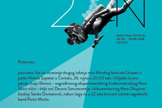Kraj rujna donosi u Cavtat drugi mini filmski festival Unseen, koji će u pet dana trajanja, od 26. do 30. rujna, cavtatskoj publici donijeti čak tri selekcije filmova, dvije radionice i tri koncerta.
