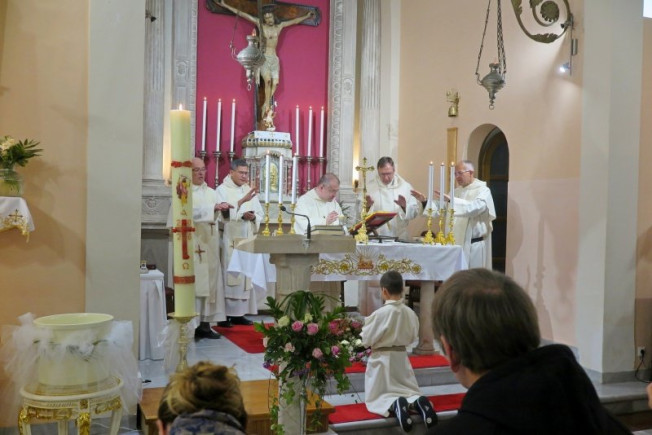 Misu s molitvom večernje iz Časoslova predslavio je župnik fr. Marin Golubović u suslavlju s učiteljem Reda i sociusom te ostalom samostanskom braćom. Mješoviti zbor župe Svetog Križa pod vodstvom profesorice Marije Brčić i uz glazbenu pratnju s novih župnih orgulja pjesmom je uzveličao slavlje.